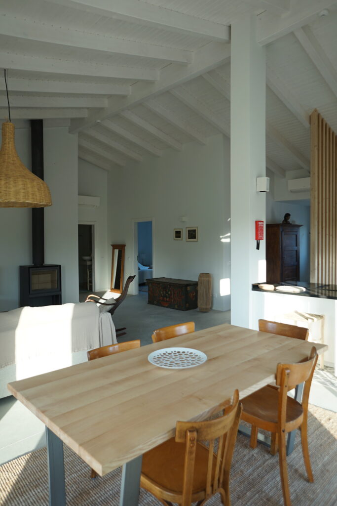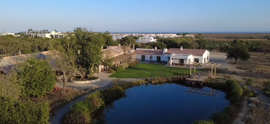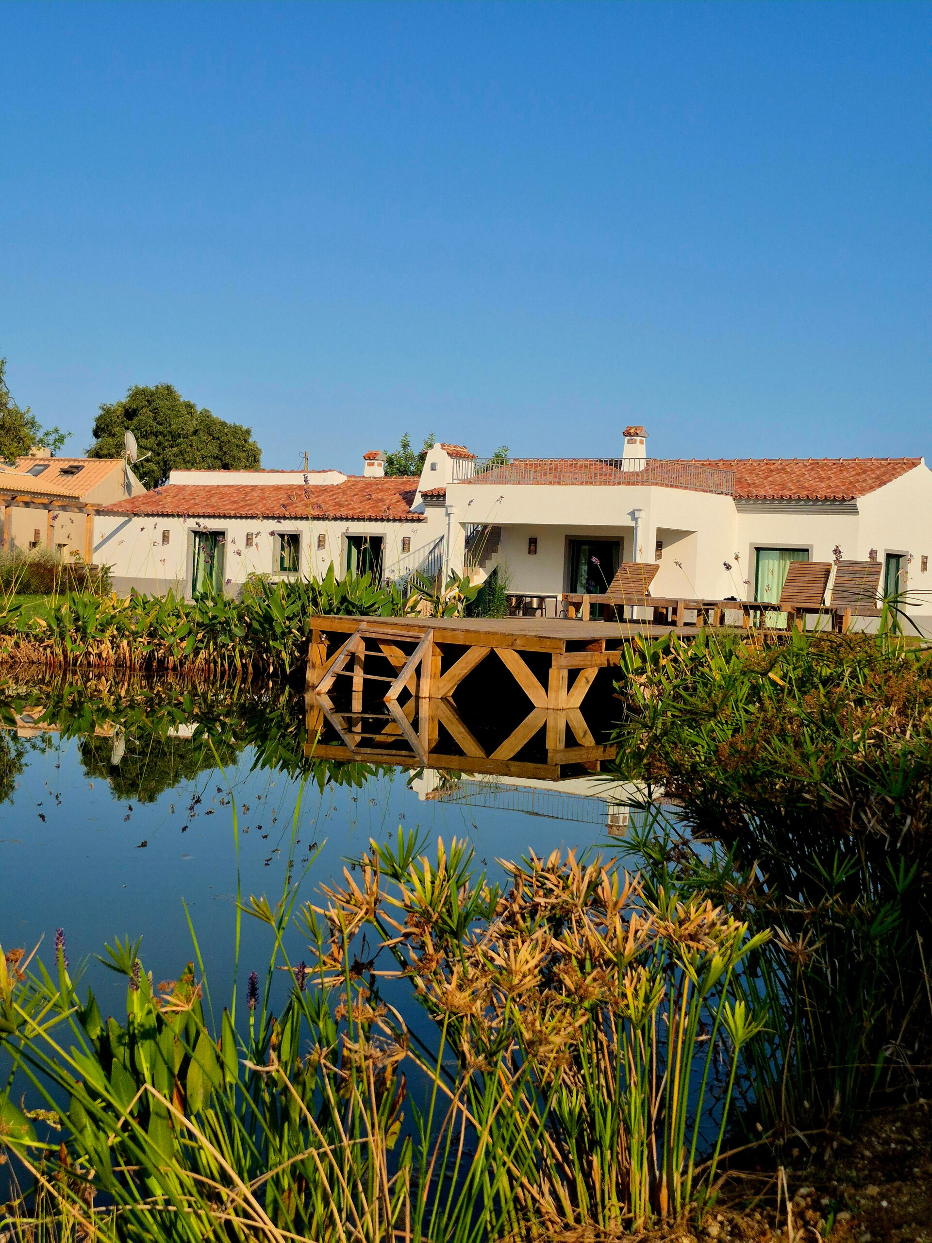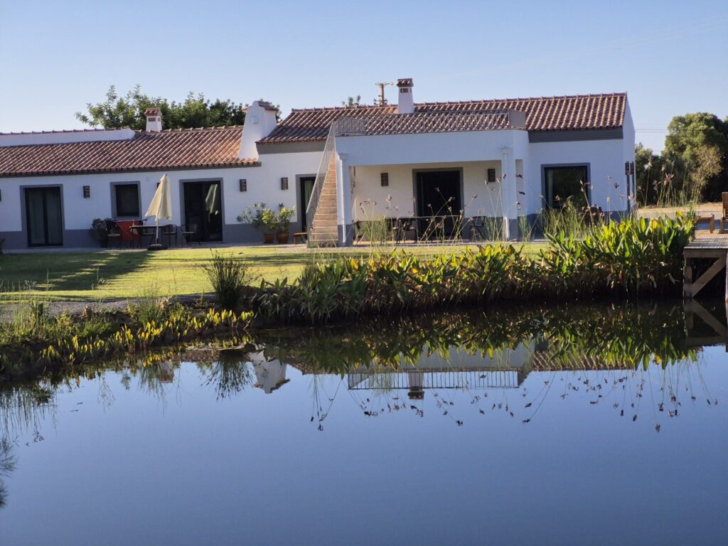 On one side, the view opens onto our natural swimming lake; on the other, it stretches across the lagoon of the Ria Formosa Nature Park, the Ilha de Tavira, and out to the Atlantic Ocean.