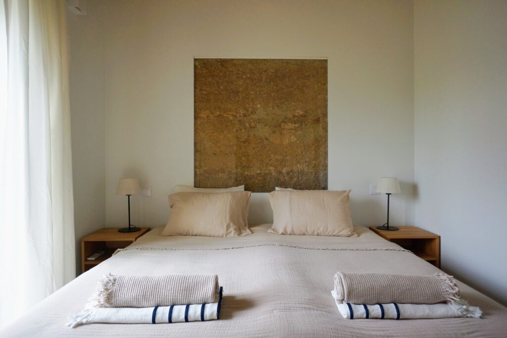 Handcrafted cement tiles in the kitchens and bathrooms add delicate accents – created by the last master craftsman in the region. Each tile is a small work of art, carrying the legacy of Portuguese craftsmanship. A traditional reed ceiling, and the exposed rammed-earth wall reflect the local architecture and the history of the house.